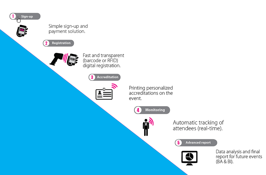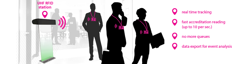 On the online platform, organizers will also have an option to rent a module, which is able to accredit and registrate participants activity. UHF (Ultra High Frequency) RFID (Radio Frequency Identification) station records UHF accreditations in the cloud. Station can accredit more than 10 participants per second. This way queues are virtually eliminated. Stations are strategically placed throughout the hall space. The most important ones are at entrances, to check if participant is accredited.